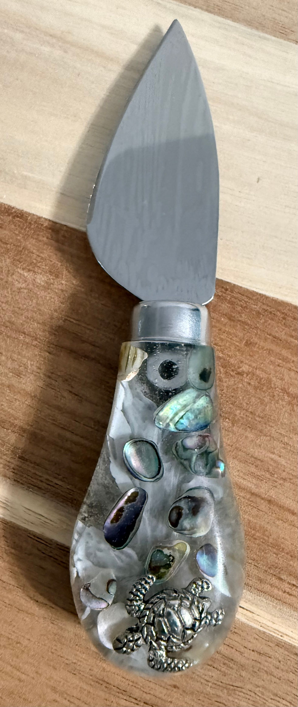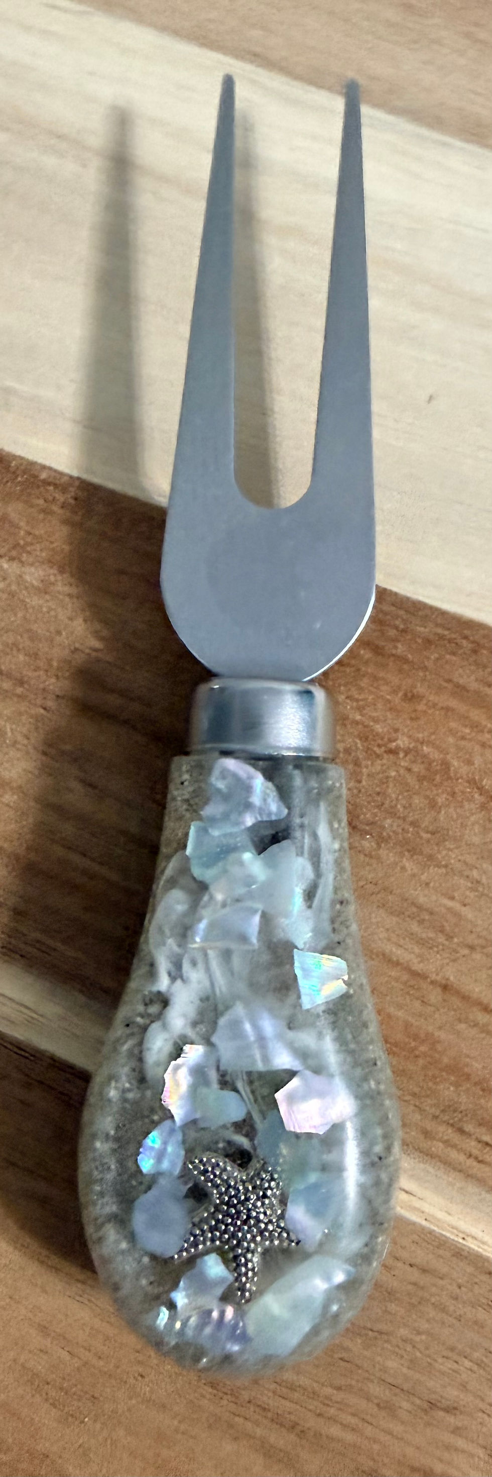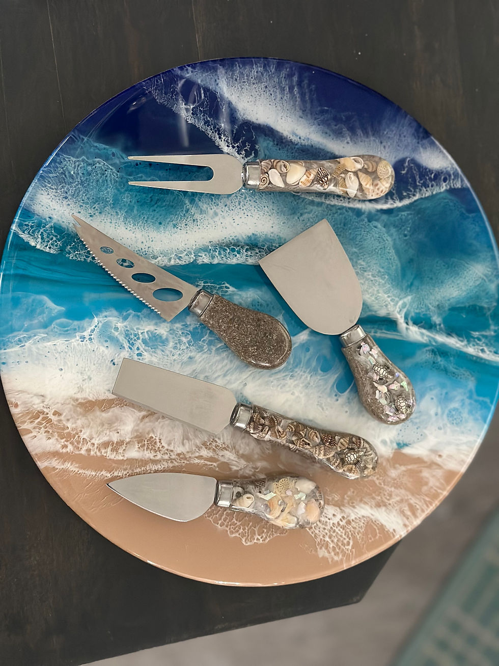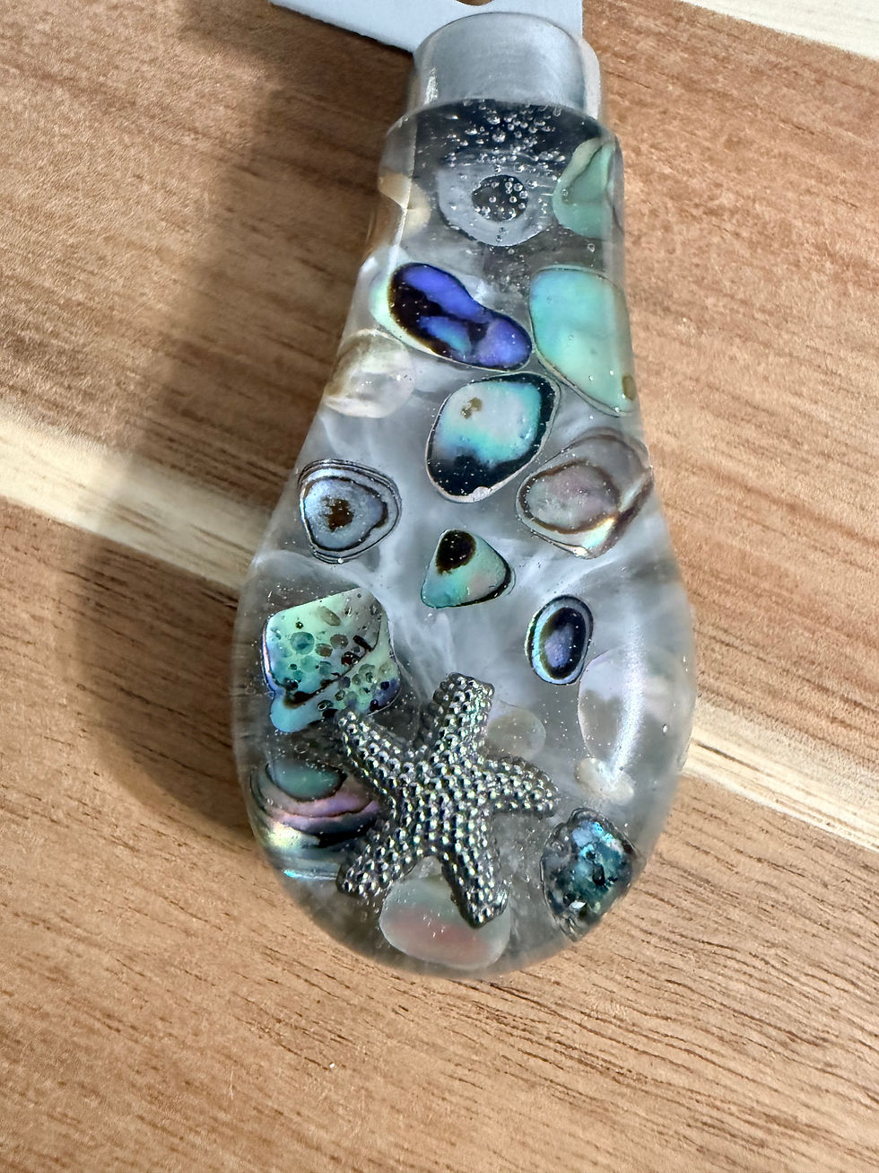Handcrafted ocean resin utensils designed with seashells, abalone, and coastal accents. Perfect for pairing with charcuterie boards or gifting to beach lovers.