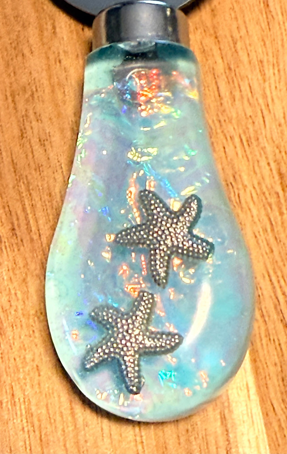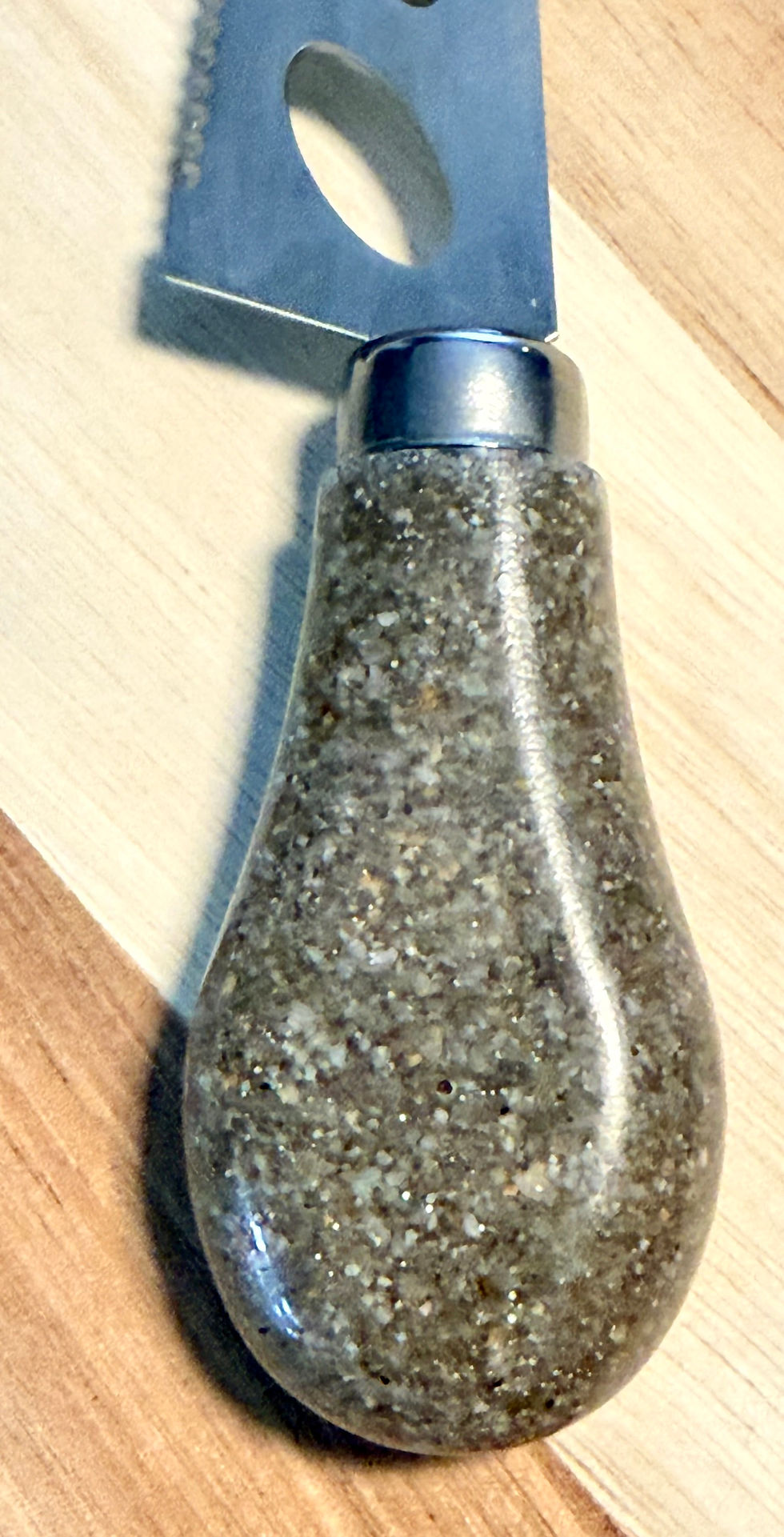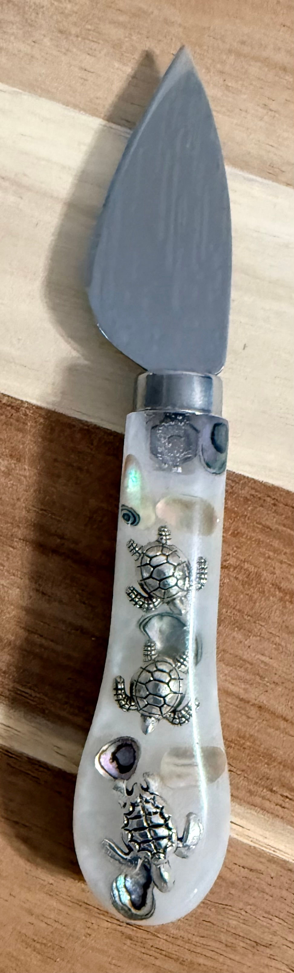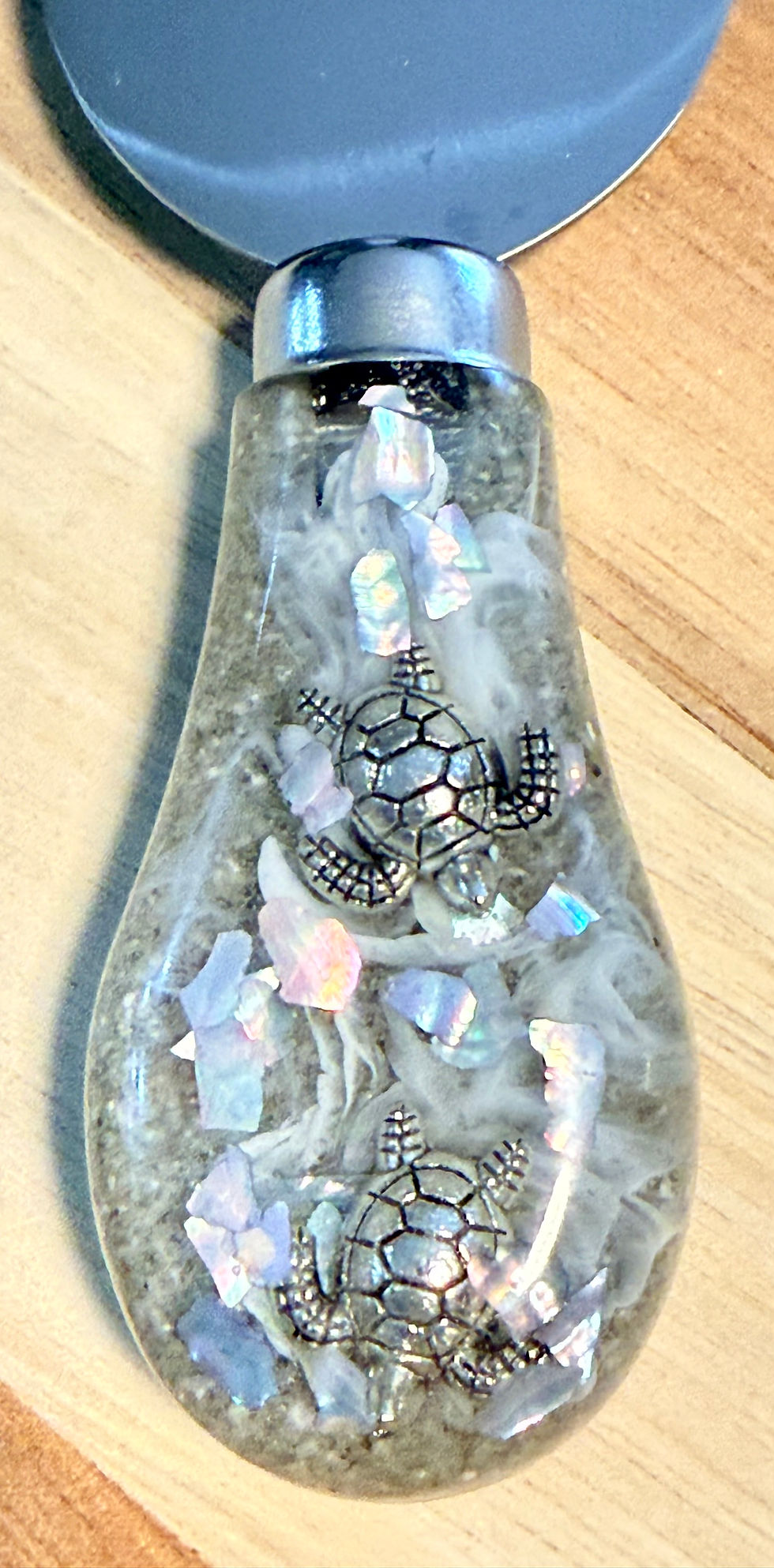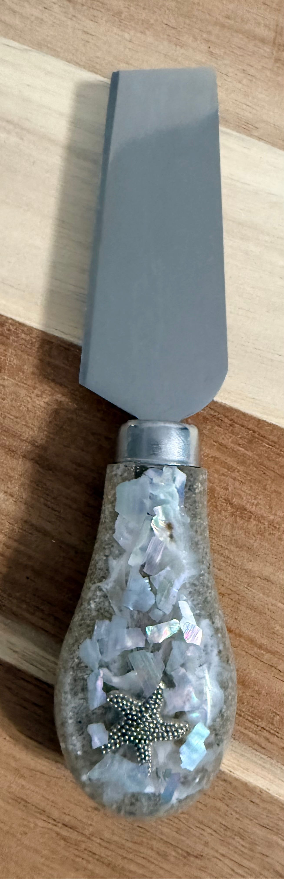 Handcrafted ocean resin utensils designed with seashells, abalone, and coastal accents. Perfect for pairing with charcuterie boards or gifting to beach lovers.
