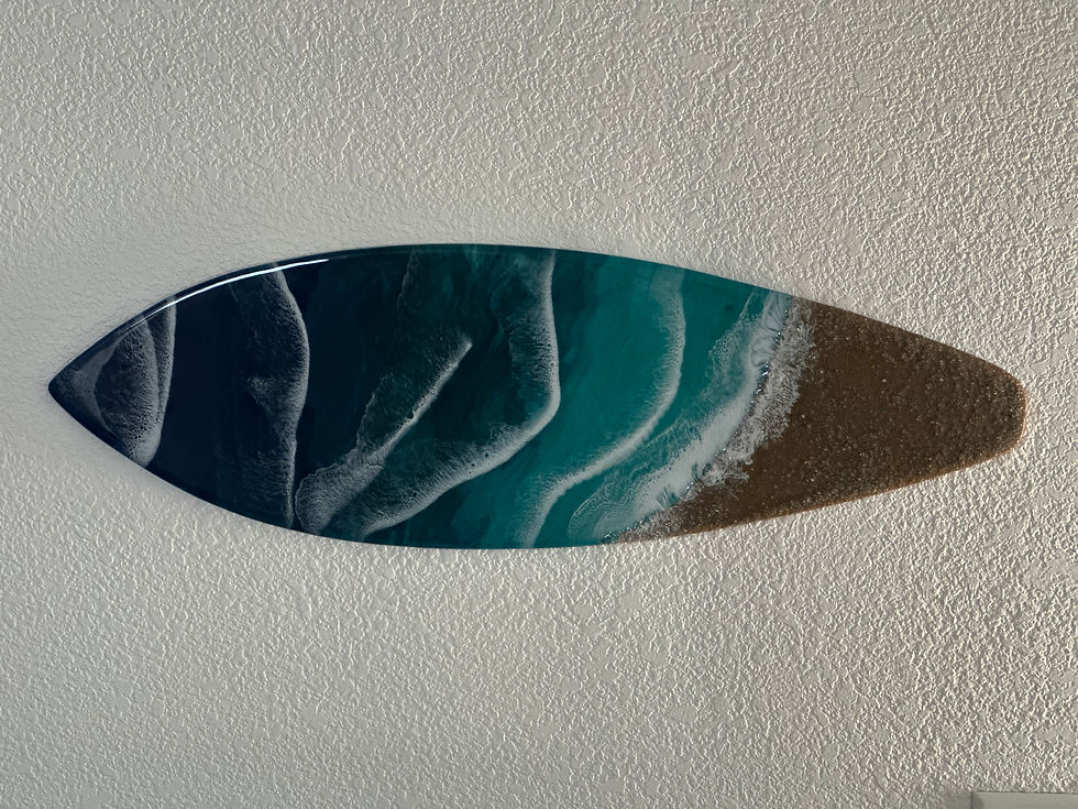 Handcrafted 3 ft resin surfboard wall art with waves, sand, and ocean blues-display horizontal or vertical for a true coastal statement.